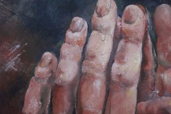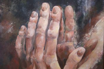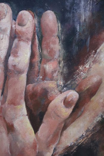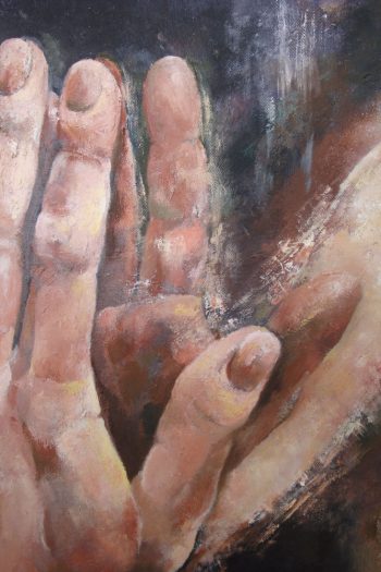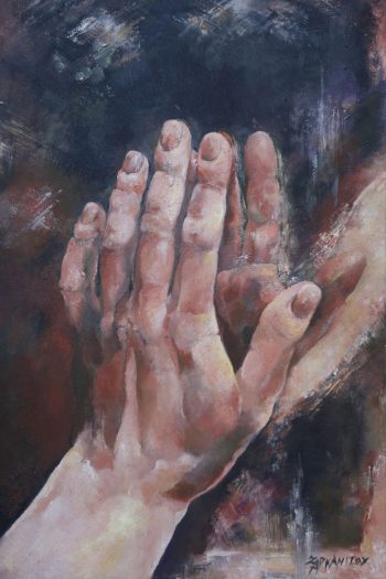 Επαφή Το χέρι ψηλαφίζει το δίδυμό του, στον υγρό καθρέφτη.