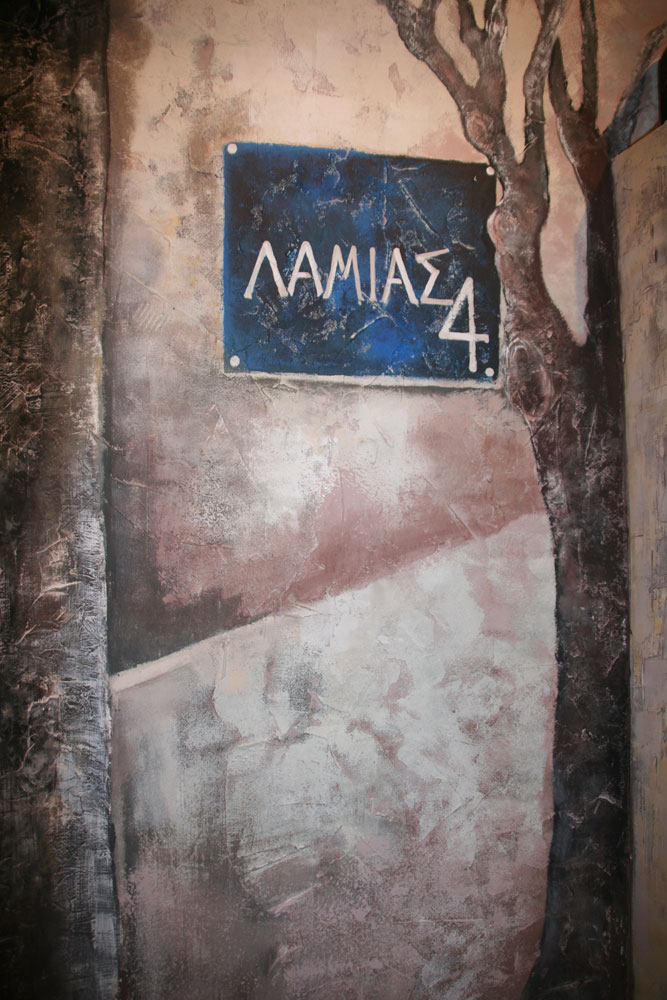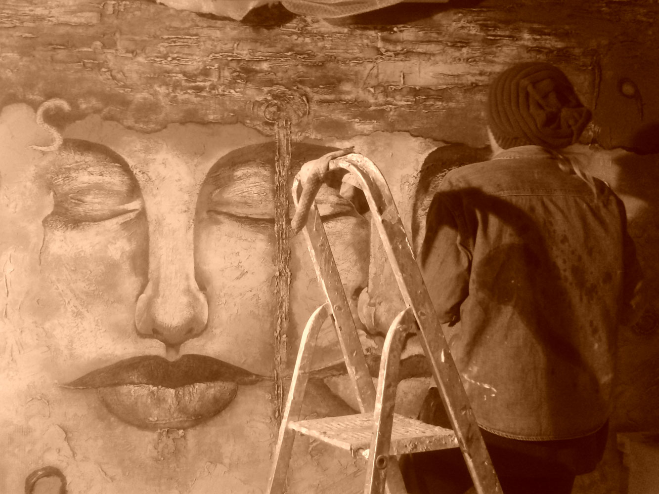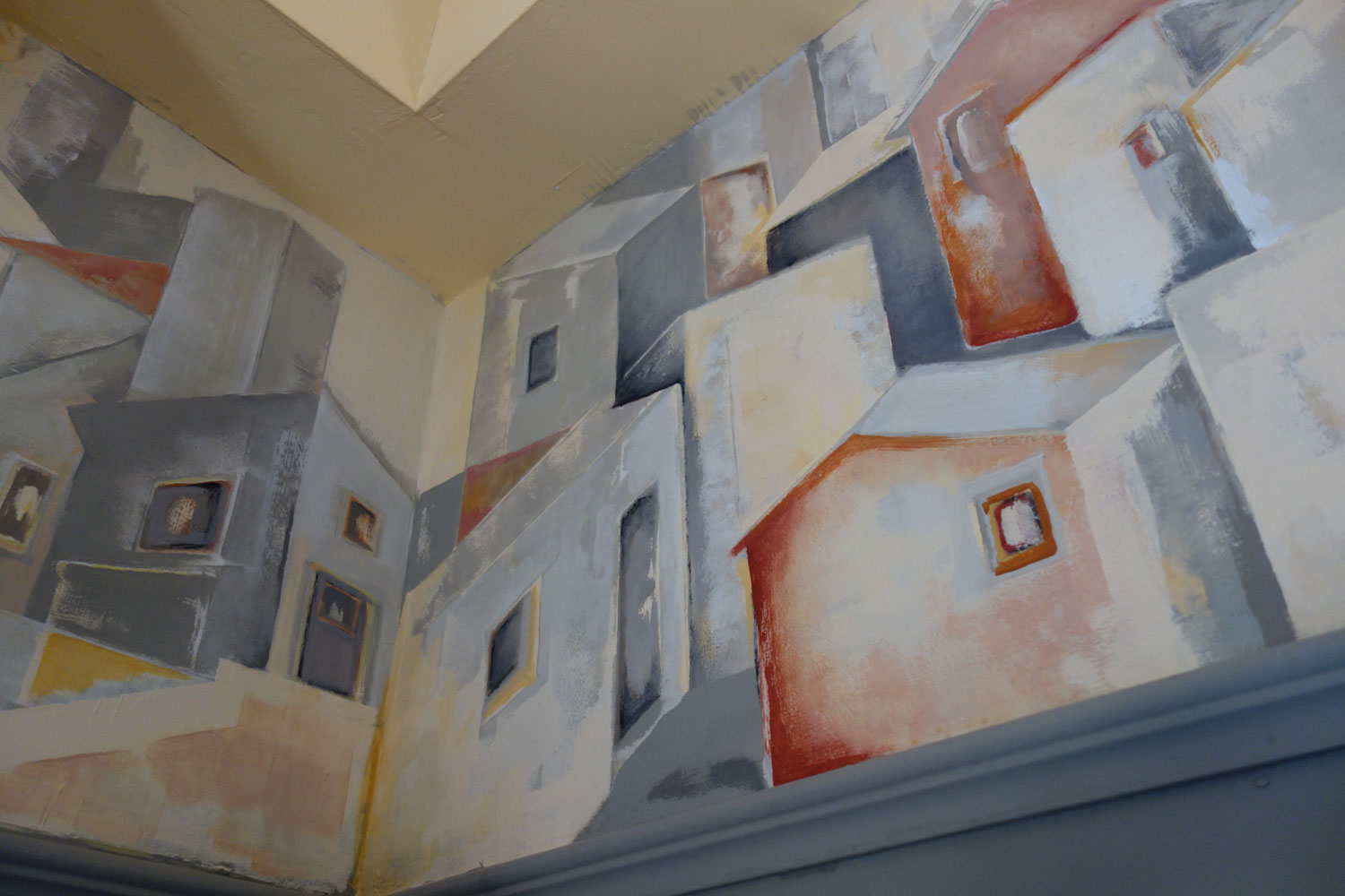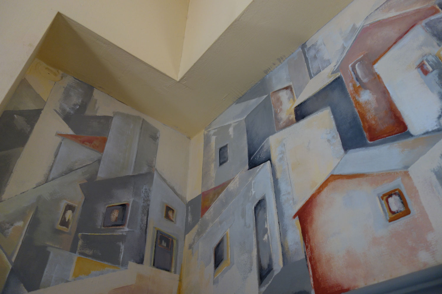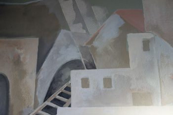 Οι τοιχογραφίες προέκυψαν από μια φανταστική συνομιλία ανάμεσα στο παγωμένο υλικό ενός τοίχου και στη διαρκώς διαφοροποιούμενη πατίνα του χρόνου. Ο τοίχος στατικός και άψυχος καμβάς, δέχεται τη δημιουργική δράση, που διαρκώς εξελίσσεται και επαναπροσδιορίζεται ανάλογα με τις συνθήκες και το απρόβλεπτο του καιρού. Η τεχνική του ανάγλυφου με στόκο κόλλα και ακρυλικά, επιτρέπει τη προσωπική μου εικαστική παρέμβαση, είτε ζωγραφικά είτε αφηρημένα, ανοίγοντάς μου το δρόμο για μελέτη και απεικόνιση της διαδικασίας.